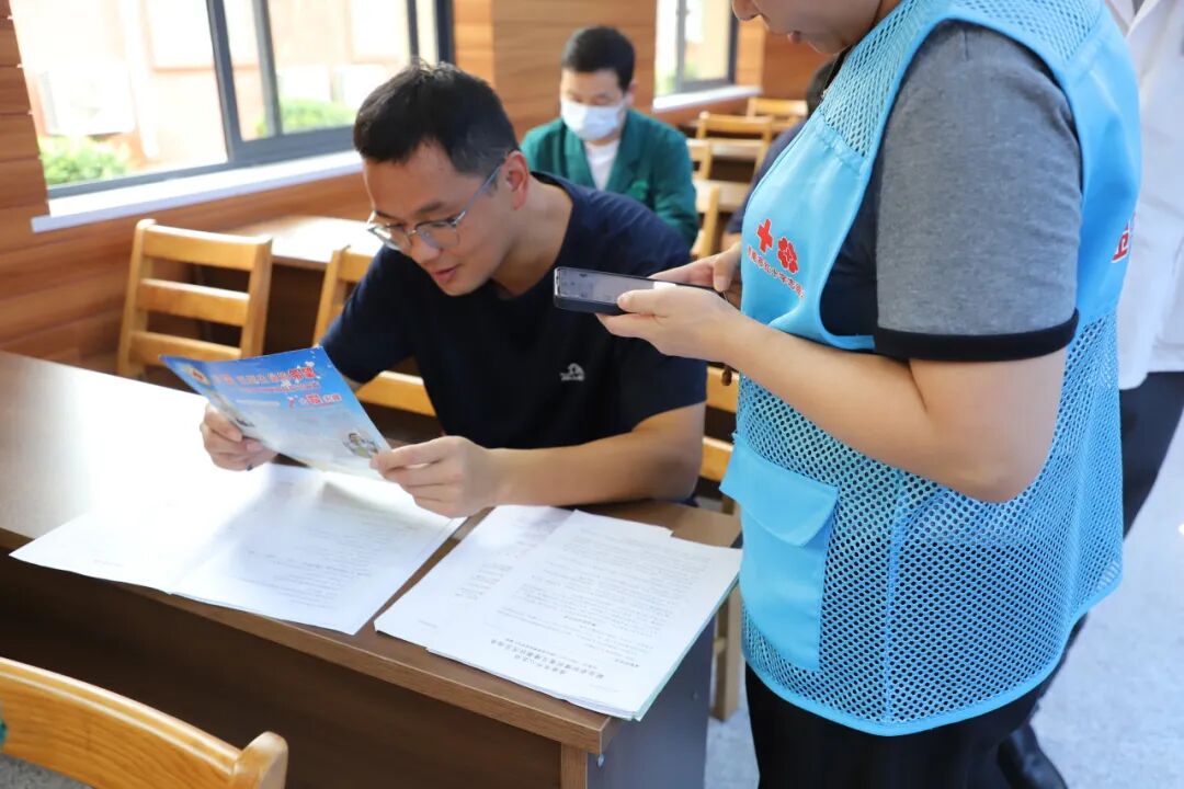 在医院多功能厅,医院职工们纷纷捋起袖子展现东方大爱,在采血工作人员的引导下,医务人员有序地进行登记、检验、抽血等准备工作。