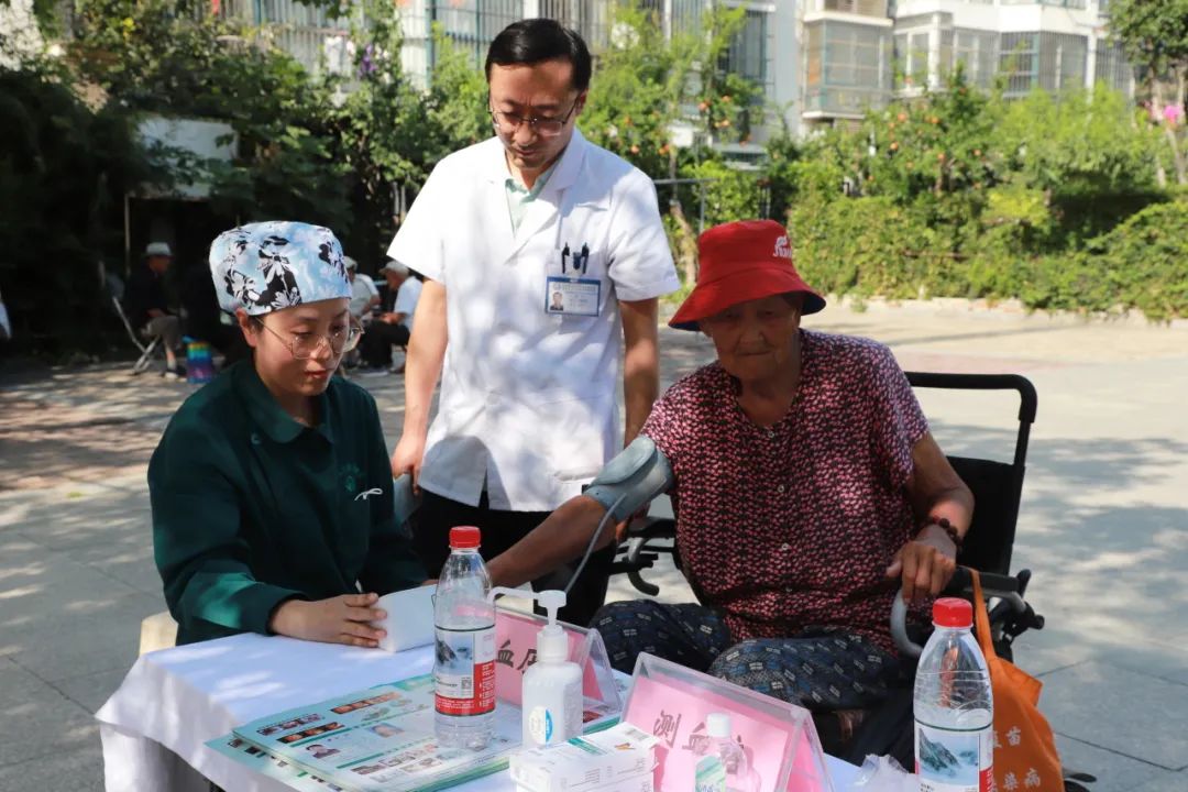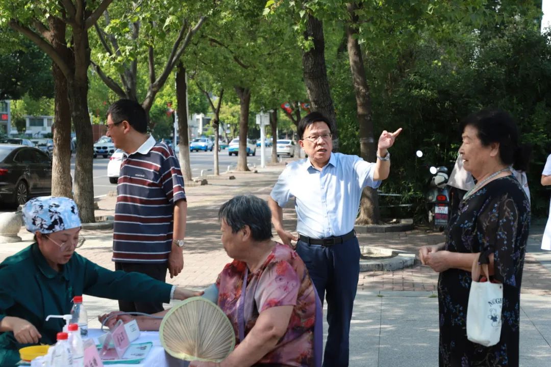 胡继年院长为现场问诊患者答疑解惑并指引就医,为社区居民介绍东方医院集团九龙门诊部送医送药的服务。