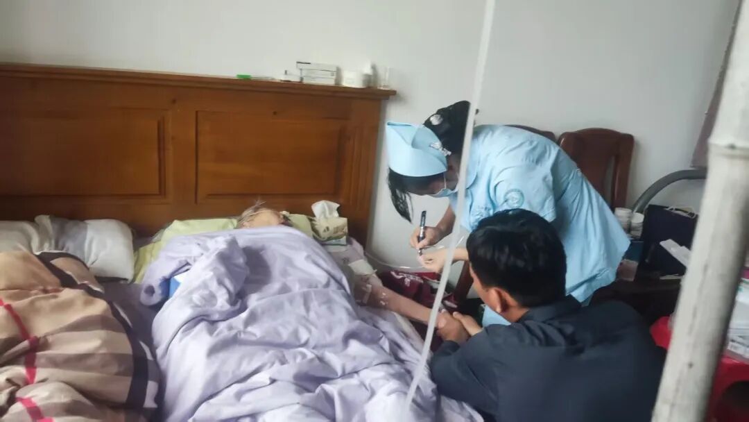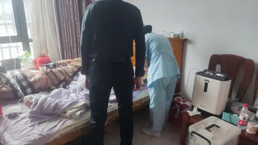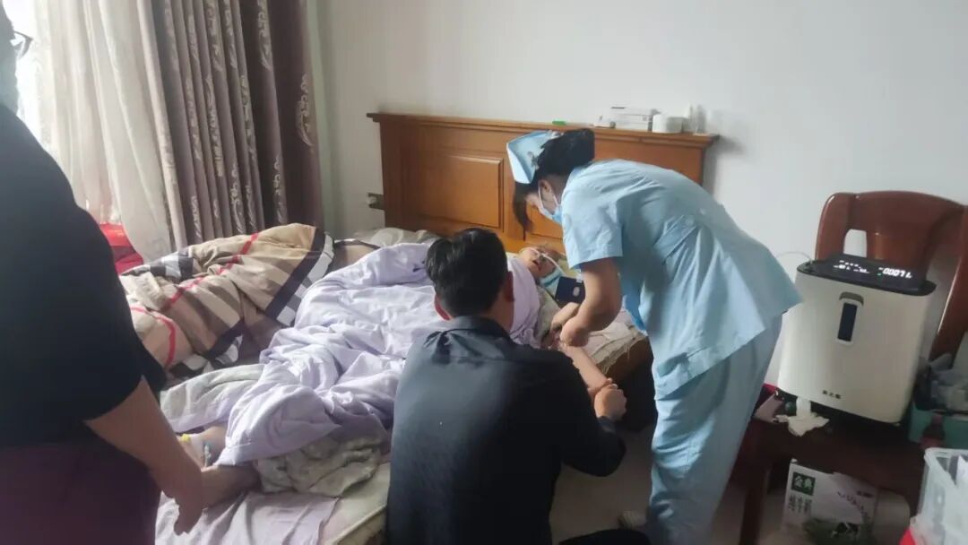 医院领导得知病人情况后立即通知了院对外联络部副部长顾勇,顾部长立刻跟患者家属联系沟通了送医送药的事宜并立马前往患者家中进行上门更换置管。