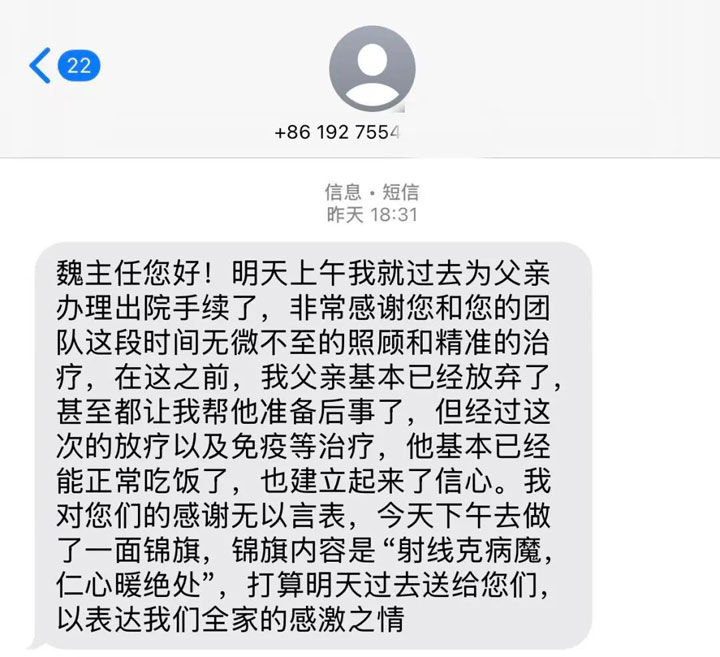 治疗出院近一月后,患者家属再次发来感谢短信并后续送来锦旗感谢,锦旗中赫然写着“射线克病魔、人心暖绝处”!