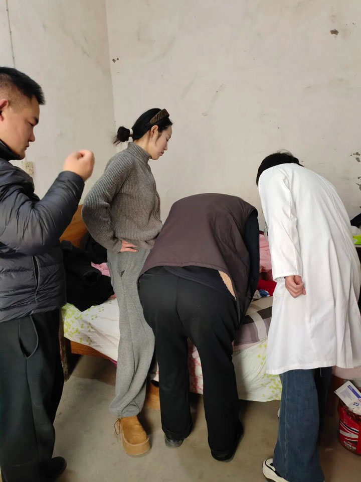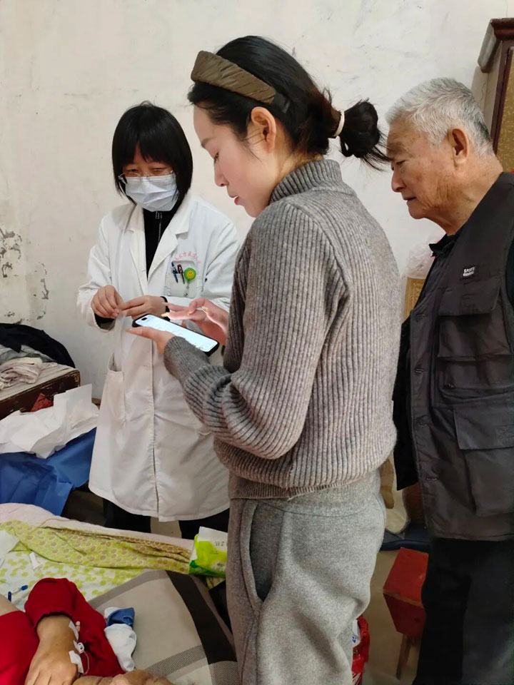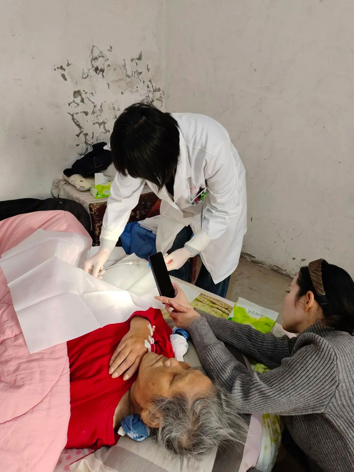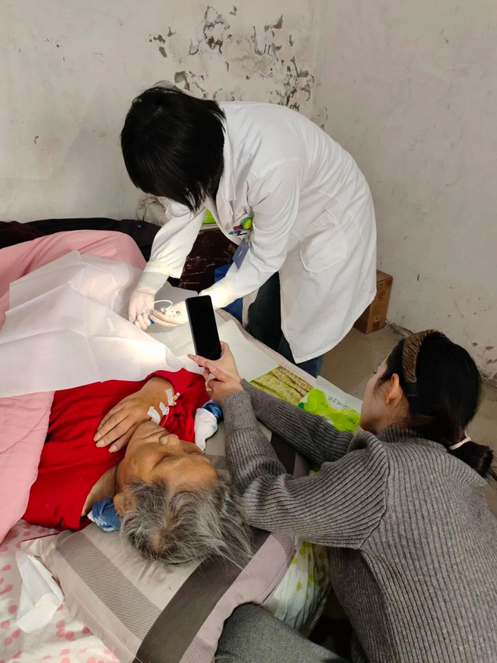 一路颠簸后,她们终于到达庞奶奶家中。来不及喝一口热水,张露露主任便立即为庞奶奶进行细致的检查、评估病情,随后熟练、规范地为老人留置了腹腔闭式引流管。整个过程中,她动作轻柔,耐心安抚,不断询问老人的感受,就像对待自己的亲人一样。