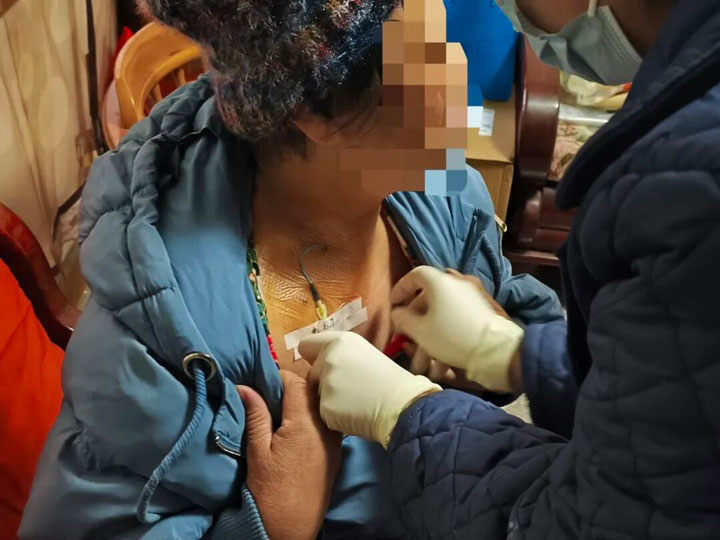 进门后,侯先慧医生首先为汤女士进行了细致入微的体检,张雪梅主管护师则按标准化流程对汤女士的PICC开展了维护操作。整个过程有条不紊,每一步都严谨规范,丝毫未因环境的改变而降低操作标准。