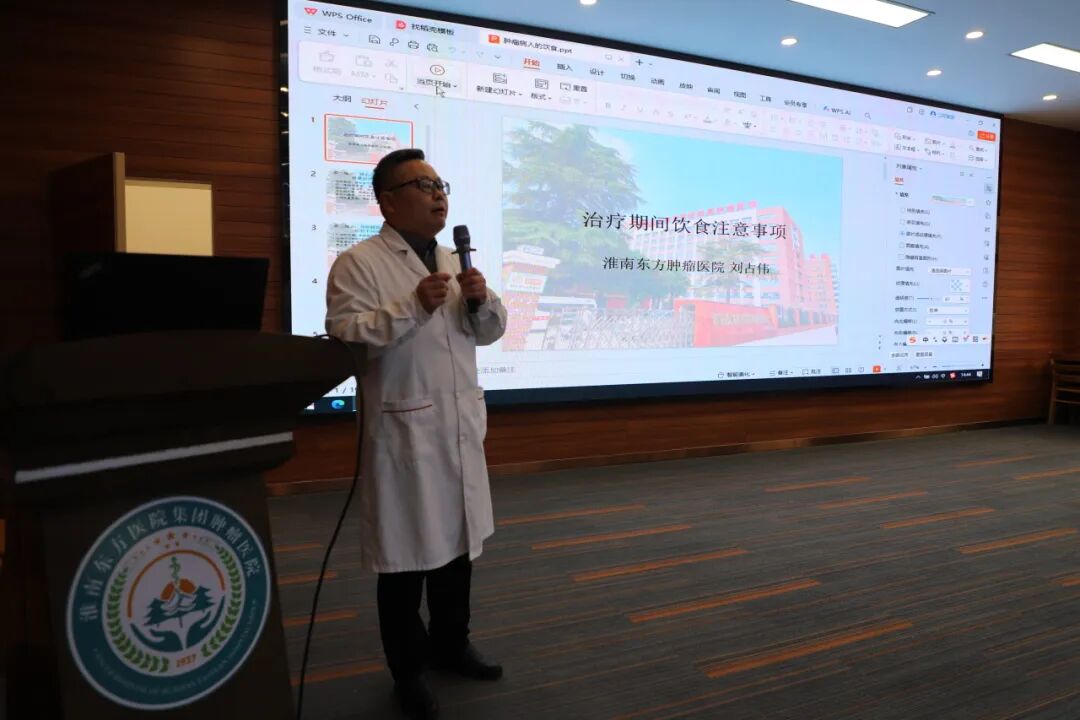 肿瘤患者的营养支持,是影响治疗效果、生活质量和预后的关键环节,却也常常是困扰家庭的现实难题。座谈会中途,由肿瘤医院副院长刘占伟带来题为 《肿瘤患者治疗期间饮食注意事项》 的专题PPT演讲。